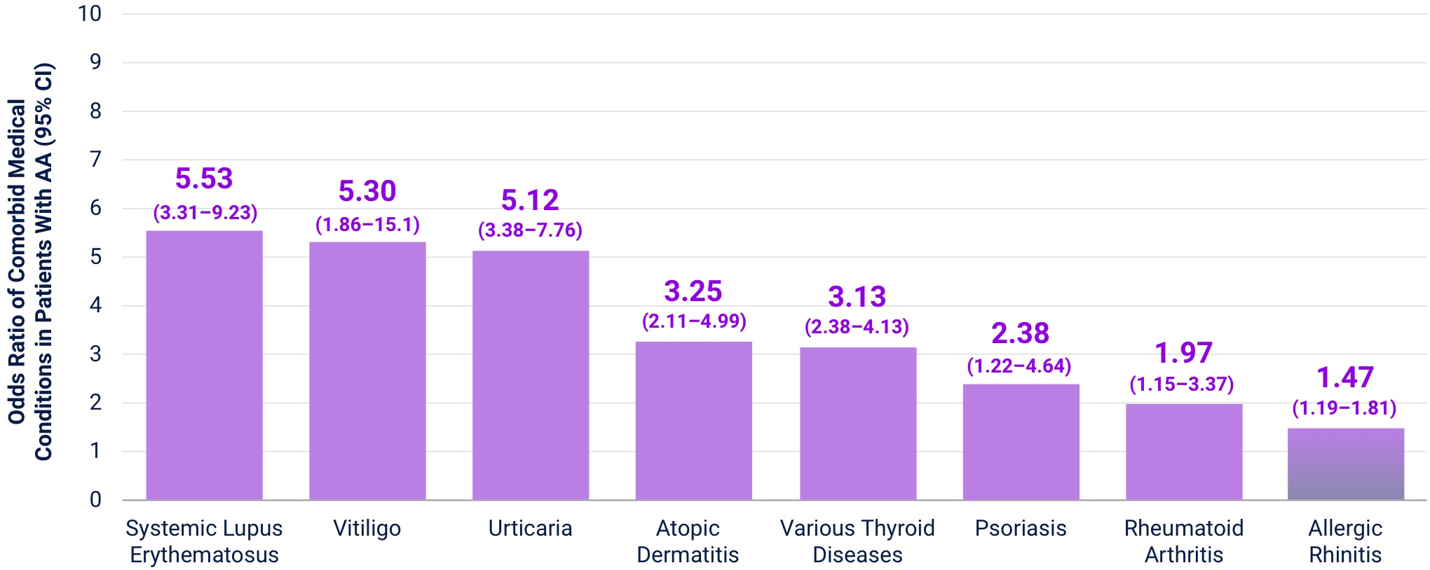 AA is associated with a 43% higher risk of new-onset atopic dermatitis (AD) and a 45% higher risk of other, new onset immune‑mediated conditions.19,20*